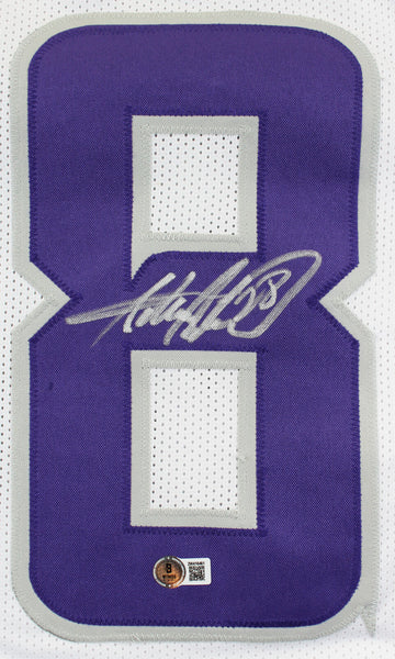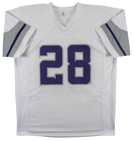 This Autographed White Alternate Pro Style Jersey has been Personally Signed by Adrian Peterson of the Minnesota Vikings. This item is 100% Authentic to include a hologram by Beckett Authentication Services. This item will come with an affixed Beckett Authentication Services (BAS) authentication sticker, which includes a scannable QR code to verify authenticity. Please note that Beckett no longer provides serial-numbered COA cards, and the attached BAS sticker will serve as the complete authentication for this item. This is a BAS Witnessed Protection Program item which means a Beckett Authentication Service representative was present when this item was being signed. We conducted an autograph signing with Adrian Peterson where multiples of the same item were signed. While the photographs are representative of this item, the size, placement and strength of the signature may vary. Each item is hand signed, therefore, each autograph is unique. This item can be verified through BAS Witnessed. This is a X-Large sized, non-branded, custom-stitched Jersey.
