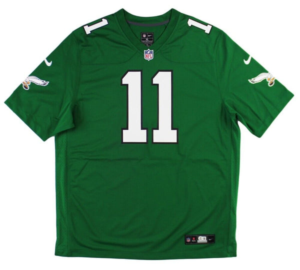 A Philadelphia Eagles Nike Game Kelly Green NFL Jersey hand signed by AJ Brown. The item and signature are in excellent condition. AJ is wide receiver for the Philadelphia Eagles. He was drafted into the NFL in 2019 by the Tennessee Titans. He played college football for Ole Miss. AUTHENTICATION: The item is accompanied by a Beckett Serial Numbered and Databased Hologram.