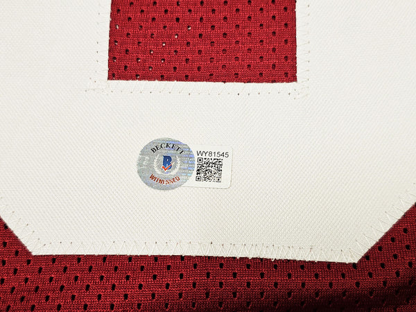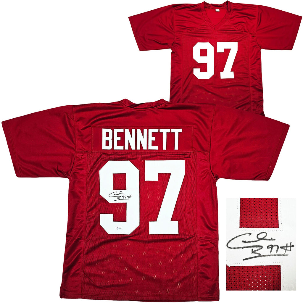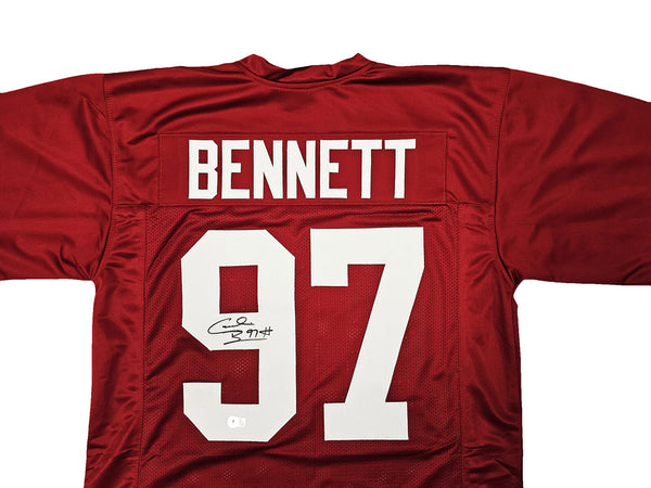 This is a Maroon Jersey that has been hand signed by Cornelius Bennett. This is a custom jersey with no name brand. The approximate size is XL. It has nice sewn in name and numbers. This item has been witnessed and certified authentic by Beckett Authentication (BAS) and comes with their tamper-proof witness sticker. Beckett Authentication has recently changed their physical certificate card policy where they no longer match their tamper-proof sticker with a physical certificate. A certificate can be printed on Beckett's website for the matching authentication number.