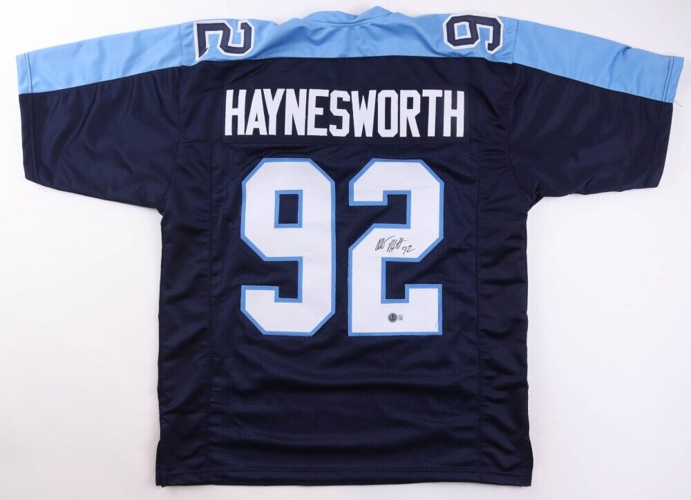 Custom on-field style jersey. Everything sewn on, size XL. Hand-signed in black felt-tip pen by Albert Haynesworth. The lot / autograph(s) includes an official Beckett Authentication Services serially-numbered hologram and QR Code card for authenticity purposes. The signing of this item was witnessed by Beckett.Authentication: Beckett Hologram with QR Code cardCustom on-field style jerseys are a more affordable option for autograph seekers. These jerseys do not have any brand name or tags and are made in the Philippines. They feature stitched on names and numbers and are made to look very similar to the on-field jerseys that the players wear. These custom jerseys are very commonly used in the memorabilia industry.