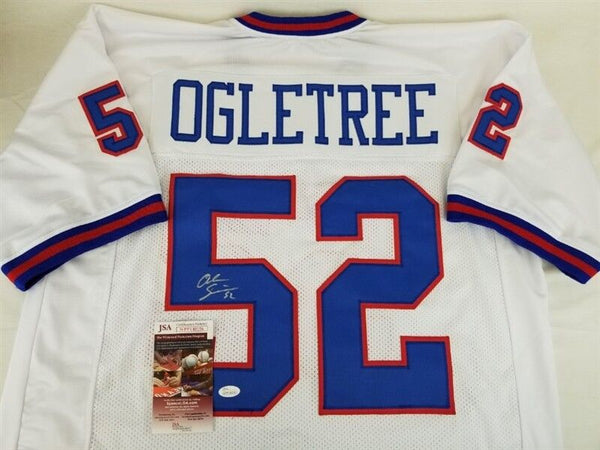 This autographed jersey has been personally hand-signed by Alec Ogletree of the New York Giants. This autograph is certified by James Spence Authentication's (JSA) Witnessed Protection Program. That means that a JSA representative was present when this item was signed. It comes with the numbered hologram and matching Certificate of Authenticity. --------------------------------------------------------------------------------------------------------------- Custom on-field style jerseys are a more affordable option for autograph seekers. These jerseys do not have any brand name or tags and are made in the Philippines. They feature stitched on names and numbers and are made to look very similar to the on-field jerseys that the players wear. These custom jerseys are very commonly used in the memorabilia industry.