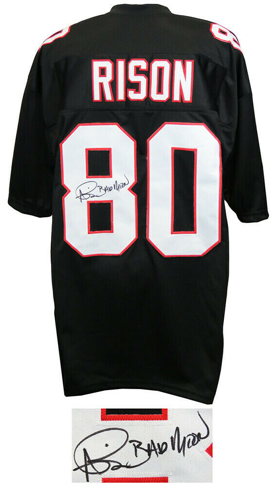 Andre Rison signed black throwback custom football jersey with 'Bad Moon' inscription. Item comes with a Schwartz Sports Memorabilia tamper-proof numbered hologram and Certificate of Authenticity which can be verified online. Jersey is size XL.
