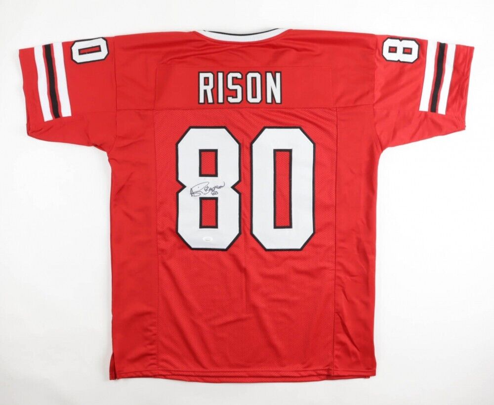 Custom on-field style jersey. Everything sewn on, size XL. Hand-signed and inscribed by Andre Rison.The lot / autograph(s) includes an official James Spence Authentication (JSA) hologram and QR Code card for authenticity purposes. The signing of this item was witnessed by JSA.Authentication: JSA QR Code card