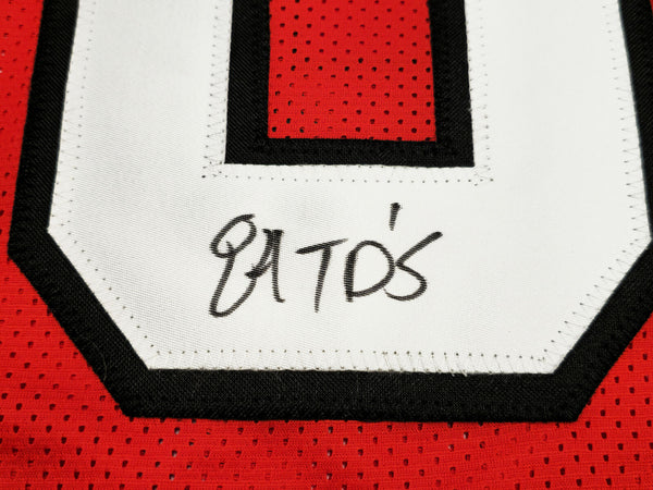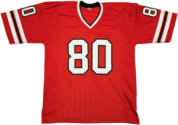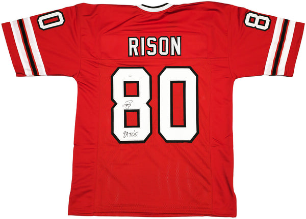This is a Red Jersey that has been hand signed by Andre Rison. This is a custom jersey with no name brand. The approximate size is XL. It has nice sewn in name and numbers. This item was inscribed "84 TD." This item has been certified authentic by JSA and comes with their tamper-proof sticker BUT IS MISSING the matching certificate of authenticity.