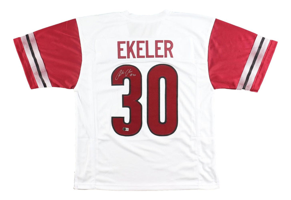 Featured is an Austin Ekeler signed custom football jersey. This jersey has been hand signed by Ekeler and comes with the Beckett hologram and certificate of authenticity. This jersey has professionally sewn letters and numbers and is size XL. This jersey has no team tags or emblems and is intended as a sports collectible. This jersey would make a great addition to any sports collection!. SPECIFICATIONS Autographed By: Austin Ekeler Team: Washington Commanders Sport: Football Authentication: Beckett Grading Services