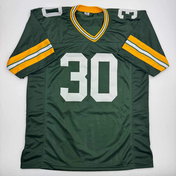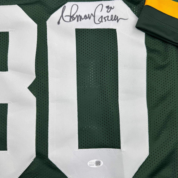 Autographed/Signed Ahman Green Green Bay Green Football Jersey Beckett BAS COA Jersey has no brand names or logos. This is a custom jersey and was not manufactured by or in any manner associated with any professional sports league or manufacturer. This custom jersey carries no professional sports league designation. The item is intended to be an autographed collectible. The custom jersey displays the name and number of the player. This item in no way is affiliated with or connected to any professional sports organization. Size is XL.