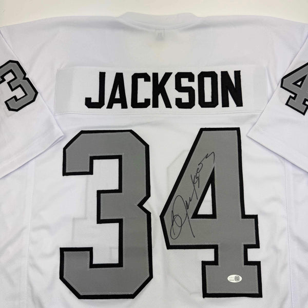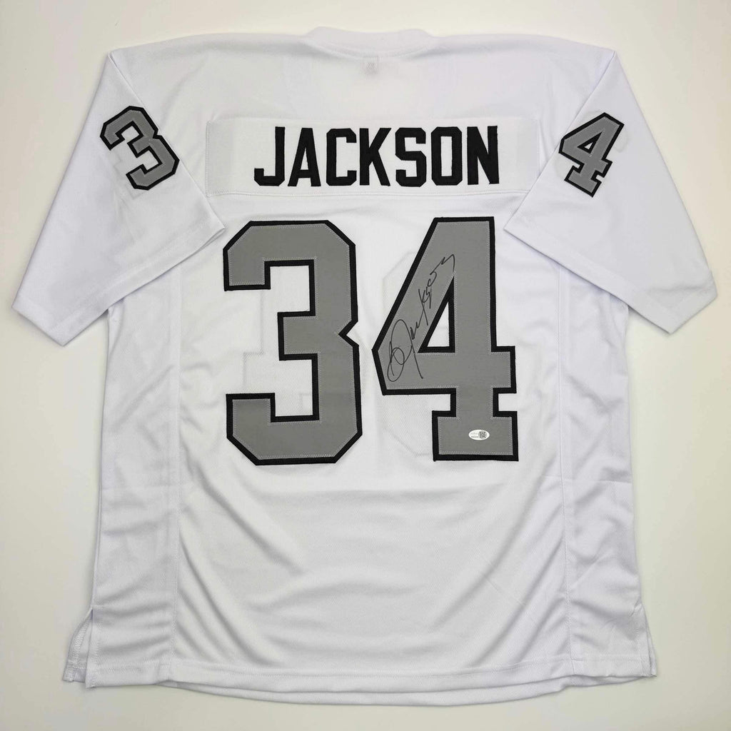 Autographed/Signed Bo Jackson Oakland White Color Rush Football Jersey JSA COA Jersey has no brand names or logos. This is a custom jersey and was not manufactured by or in any manner associated with any professional sports league or manufacturer. This custom jersey carries no professional sports league designation. The item is intended to be an autographed collectible. The custom jersey displays the name and number of the player. This item in no way is affiliated with or connected to any professional sports organization. Size is XL.