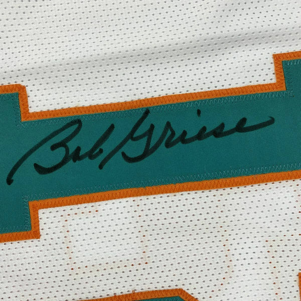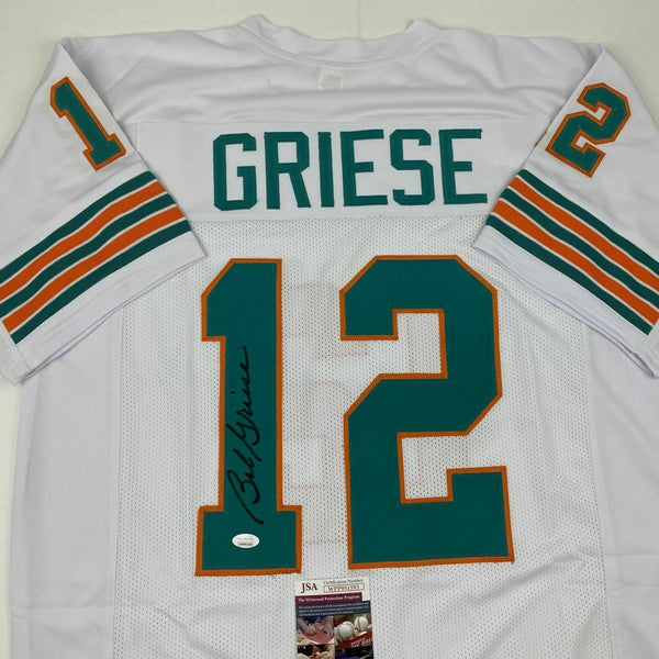 Autographed/Signed BOB GRIESE Miami White Football Jersey JSA COA Auto This is a custom jersey and was not manufactured by or in any manner associated with any professional sports league or manufacturer. This custom jersey carries no professional sports league designation. The item is intended to be an autographed collectible. Reference of team in the title is to allow the purchaser a point of association. The custom jersey displays the name, number and authenticated signature of the player. This item in no way is affiliated with or connected to any professional sports organization. The autograph, as always is guaranteed to be authentic and has been certified as authentic by a third-party, trusted authenticator. Size is XL unless otherwise noted.
