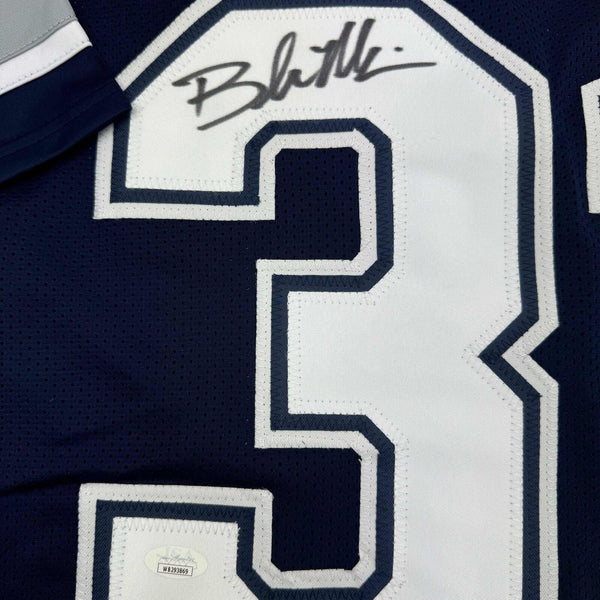 Autographed/Signed Brock Marion Dallas Blue Football Jersey JSA COA Jersey has no brand names or logos. This is a custom jersey and was not manufactured by or in any manner associated with any professional sports league or manufacturer. This custom jersey carries no professional sports league designation. The item is intended to be an autographed collectible. The custom jersey displays the name and number of the player. This item in no way is affiliated with or connected to any professional sports organization. Size is XL.