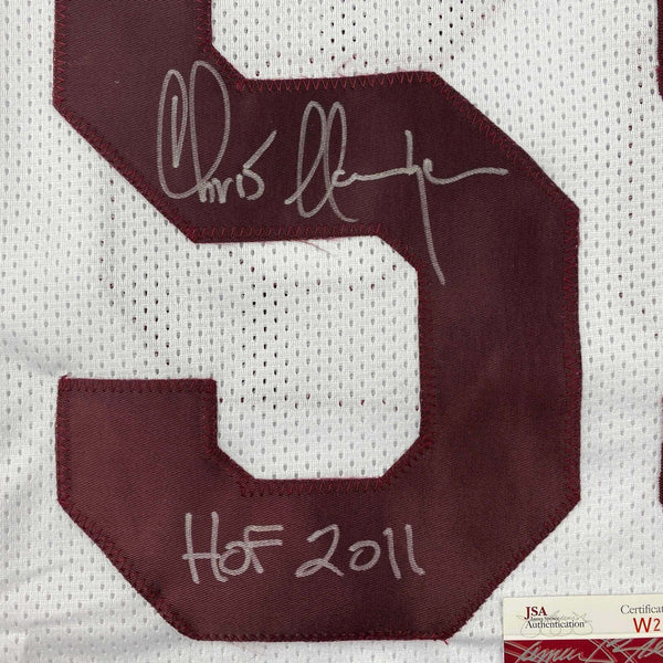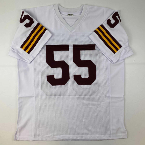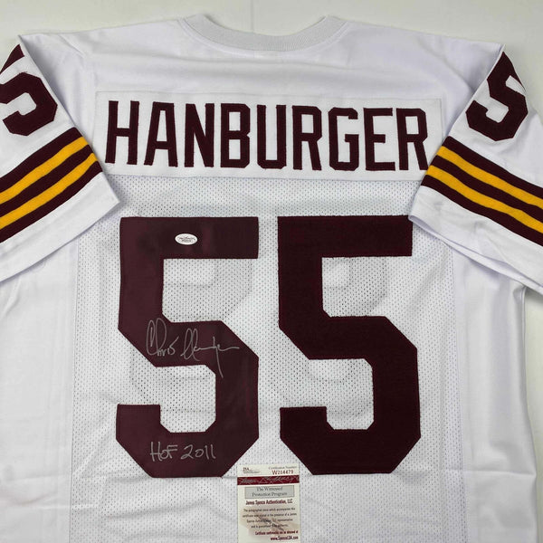 Autographed/Signed Chris Hanburger HOF 2011 Washington White Jersey JSA COA Jersey has no brand names or logos. This is a custom jersey and was not manufactured by or in any manner associated with any professional sports league or manufacturer. This custom jersey carries no professional sports league designation. The item is intended to be an autographed collectible. The custom jersey displays the name and number of the player. This item in no way is affiliated with or connected to any professional sports organization. Size is XL.