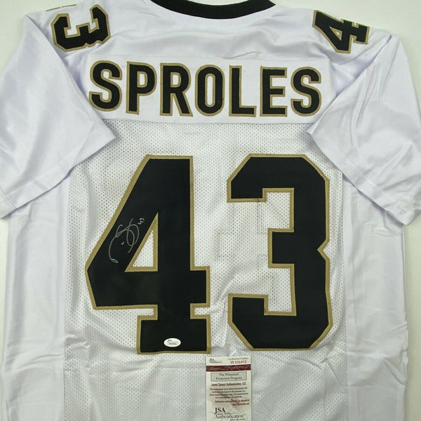 Autographed/Signed DARREN SPROLES New Orleans White Football Jersey JSA COA This is a custom jersey and was not manufactured by or in any manner associated with any professional sports league or manufacturer. This custom jersey carries no professional sports league designation. The item is intended to be an autographed collectible. Reference of team in the title is to allow the purchaser a point of association. The custom jersey displays the name, number and authenticated signature of the player. This item in no way is affiliated with or connected to any professional sports organization. The autograph, as always is guaranteed to be authentic and has been certified as authentic by a third-party, trusted authenticator. Size is XL unless otherwise noted.