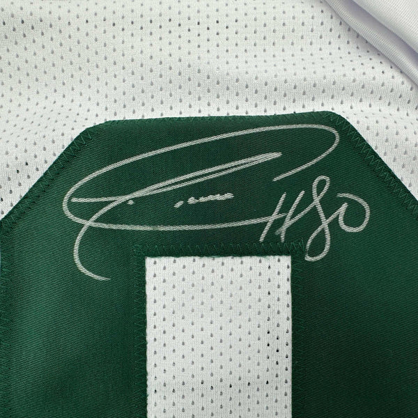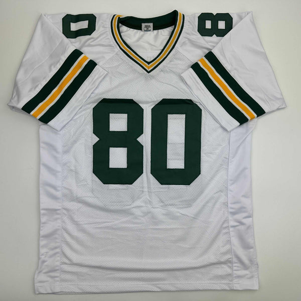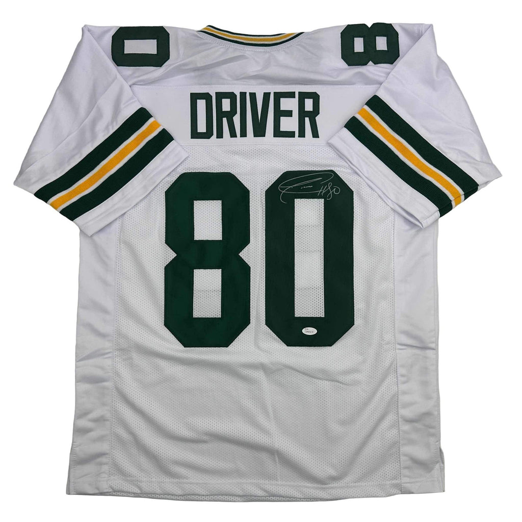 Autographed/Signed Donald Driver Green Bay White Football Jersey JSA COA Jersey has no brand names or logos. This is a custom jersey and was not manufactured by or in any manner associated with any professional sports league or manufacturer. This custom jersey carries no professional sports league designation. The item is intended to be an autographed collectible. The custom jersey displays the name and number of the player. This item in no way is affiliated with or connected to any professional sports organization. Size is XL