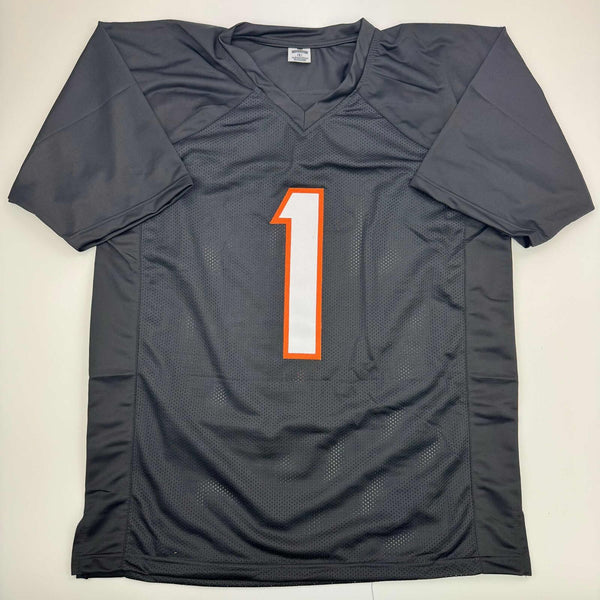 Autographed/Signed Ja'Marr Chase Cincinnati Black Football Jersey Beckett COA Jersey has no brand names or logos. This is a custom jersey and was not manufactured by or in any manner associated with any professional sports league or manufacturer. This custom jersey carries no professional sports league designation. The item is intended to be an autographed collectible. The custom jersey displays the name and number of the player. This item in no way is affiliated with or connected to any professional sports organization. Size is XL.