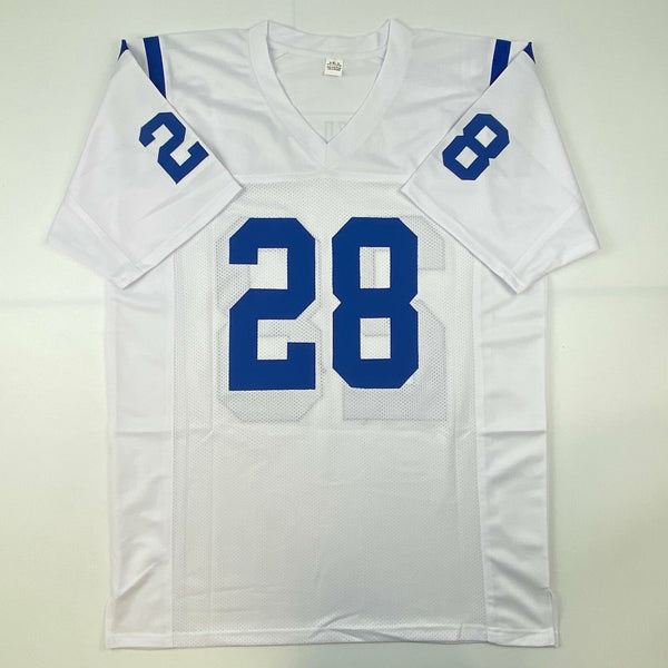 Autographed/Signed Jonathan Taylor Indianapolis White Football Jersey JSA COA Jersey has no brand names or logos. This is a custom jersey and was not manufactured by or in any manner associated with any professional sports league or manufacturer. This custom jersey carries no professional sports league designation. The item is intended to be an autographed collectible. The custom jersey displays the name and number of the player. This item in no way is affiliated with or connected to any professional sports organization. Size is XL.