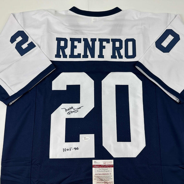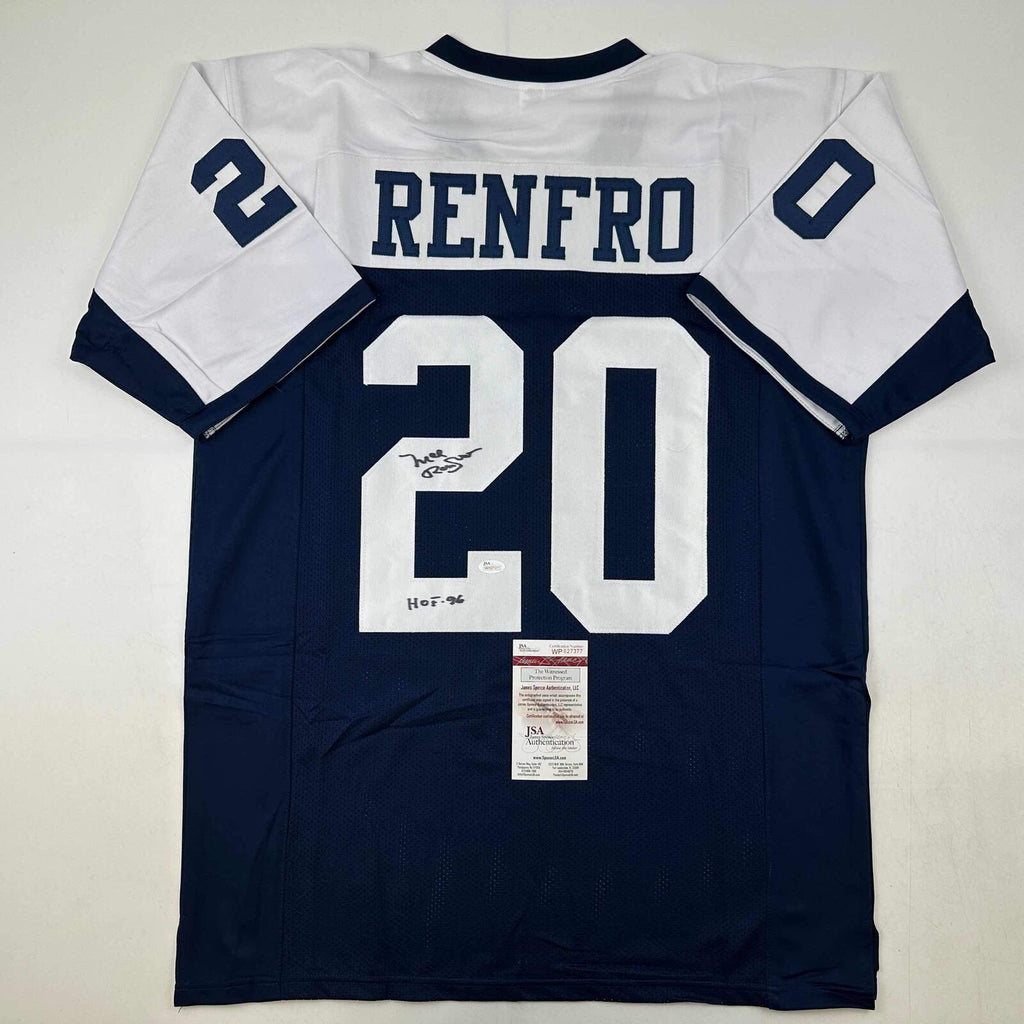 Autographed/Signed Mel Renfro HOF 96 Dallas Thanksgiving Day Jersey JSA COA Jersey has no brand names or logos. This is a custom jersey and was not manufactured by or in any manner associated with any professional sports league or manufacturer. This custom jersey carries no professional sports league designation. The item is intended to be an autographed collectible. The custom jersey displays the name and number of the player. This item in no way is affiliated with or connected to any professional sports organization. Size is XL.