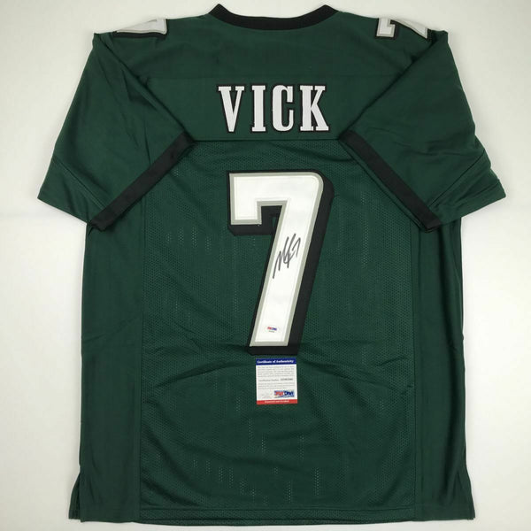 Autographed/Signed MICHAEL MIKE VICK Philadelphia Green Football Jersey PSA COA This is a custom jersey and was not manufactured by or in any manner associated with any professional sports league or manufacturer. This custom jersey carries no professional sports league designation. The item is intended to be an autographed collectible. Reference of team in the title is to allow the purchaser a point of association. The custom jersey displays the name, number and authenticated signature of the player. This item in no way is affiliated with or connected to any professional sports organization. The autograph, as always is guaranteed to be authentic and has been certified as authentic by a third-party, trusted authenticator. Size is XL unless otherwise noted.