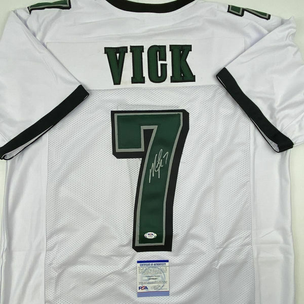 Autographed/Signed MICHAEL MIKE VICK Philadelphia White Football Jersey PSA COA This is a custom jersey and was not manufactured by or in any manner associated with any professional sports league or manufacturer. This custom jersey carries no professional sports league designation. The item is intended to be an autographed collectible. Reference of team in the title is to allow the purchaser a point of association. The custom jersey displays the name, number and authenticated signature of the player. This item in no way is affiliated with or connected to any professional sports organization. The autograph, as always is guaranteed to be authentic and has been certified as authentic by a third-party, trusted authenticator. Size is XL unless otherwise noted.
