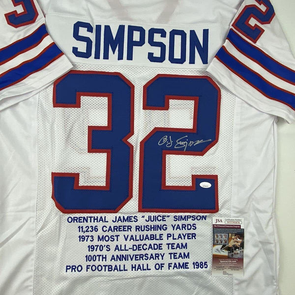 Autographed/Signed OJ O.J. SIMPSON Buffalo White Stat Football Jersey JSA COA This is a custom jersey and was not manufactured by or in any manner associated with any professional sports league or manufacturer. This custom jersey carries no professional sports league designation. The item is intended to be an autographed collectible. Reference of team in the title is to allow the purchaser a point of association. The custom jersey displays the name, number and authenticated signature of the player. This item in no way is affiliated with or connected to any professional sports organization. The autograph, as always is guaranteed to be authentic and has been certified as authentic by a third-party, trusted authenticator. Size is XL unless otherwise noted.