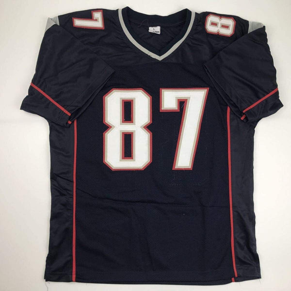 Autographed/Signed Rob Gronkowski New England Blue Jersey Beckett BAS COA Auto This is a custom jersey and was not manufactured by or in any manner associated with any professional sports league or manufacturer. This custom jersey carries no professional sports league designation. The item is intended to be an autographed collectible. Reference of team in the title is to allow the purchaser a point of association. The custom jersey displays the name, number and authenticated signature of the player. This item in no way is affiliated with or connected to any professional sports organization. The autograph, as always is guaranteed to be authentic and has been certified as authentic by a third-party, trusted authenticator. Size is XL unless otherwise noted.