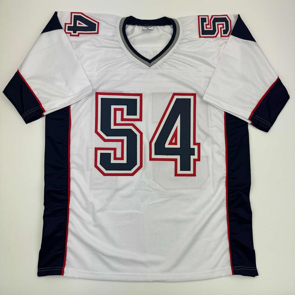 Autographed/Signed Tedy Bruschi New England White Football Jersey Beckett COA Jersey has no brand names or logos. This is a custom jersey and was not manufactured by or in any manner associated with any professional sports league or manufacturer. This custom jersey carries no professional sports league designation. The item is intended to be an autographed collectible. The custom jersey displays the name and number of the player. This item in no way is affiliated with or connected to any professional sports organization. Size is XL.
