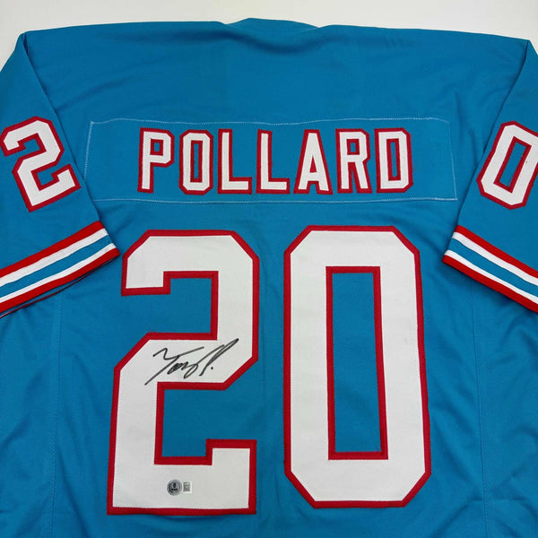 Autographed/Signed Tony Pollard Tennessee Retro Blue Football Jersey Beckett COA Jersey has no brand names or logos. This is a custom jersey and was not manufactured by or in any manner associated with any professional sports league or manufacturer. This custom jersey carries no professional sports league designation. The item is intended to be an autographed collectible. The custom jersey displays the name and number of the player. This item in no way is affiliated with or connected to any professional sports organization. Size is XL.