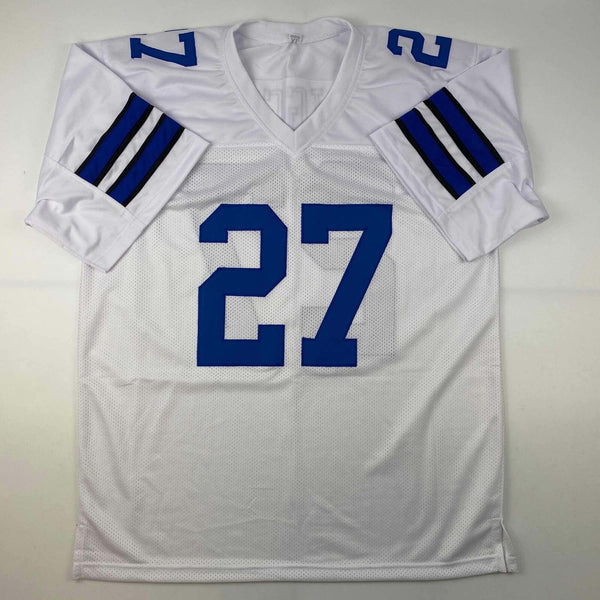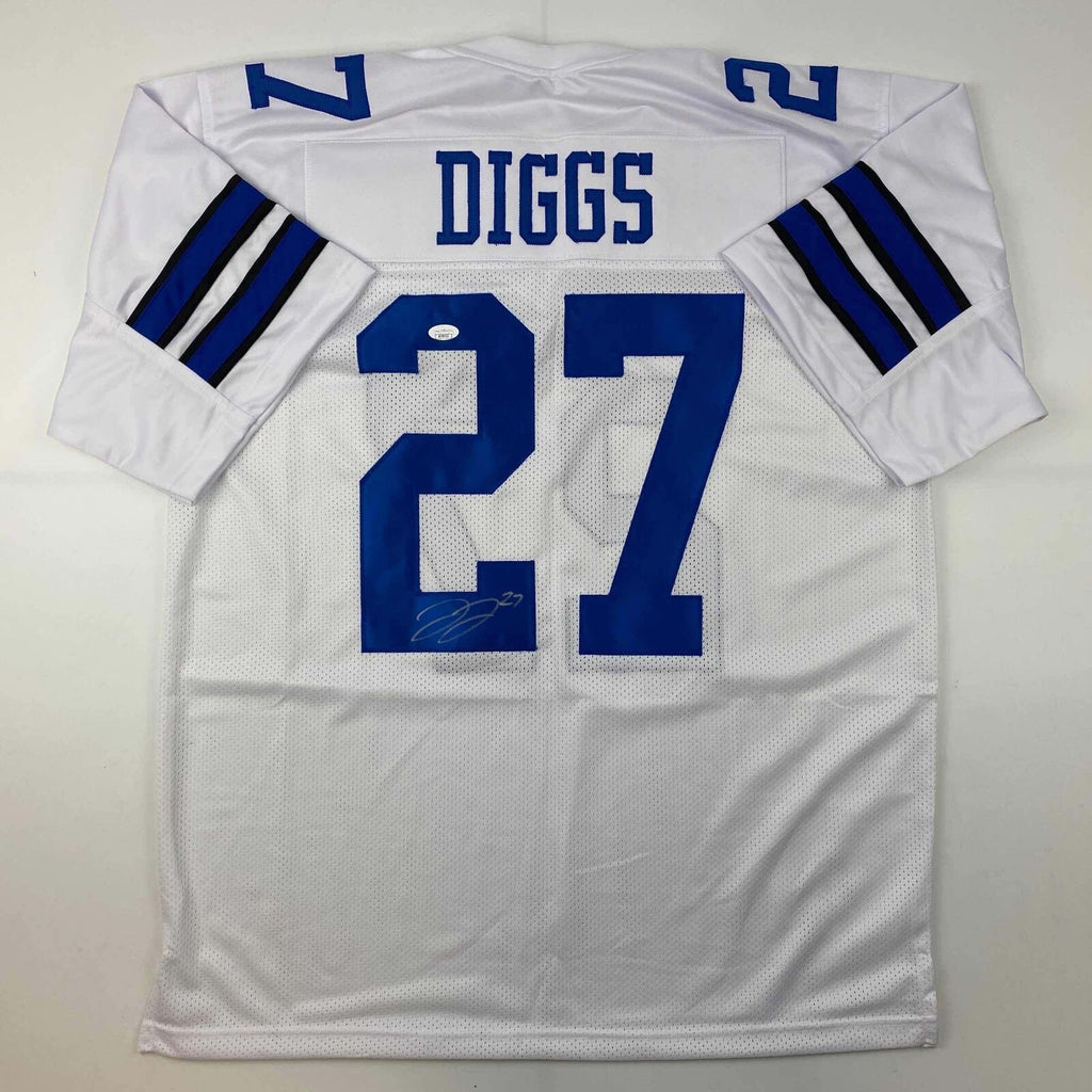 Autographed/Signed Trevon Diggs #27 Dallas White Football Jersey JSA COA Jersey has no brand names or logos. This is a custom jersey and was not manufactured by or in any manner associated with any professional sports league or manufacturer. This custom jersey carries no professional sports league designation. The item is intended to be an autographed collectible. The custom jersey displays the name and number of the player. This item in no way is affiliated with or connected to any professional sports organization. Size is XL.