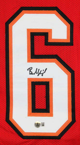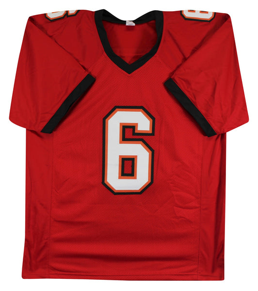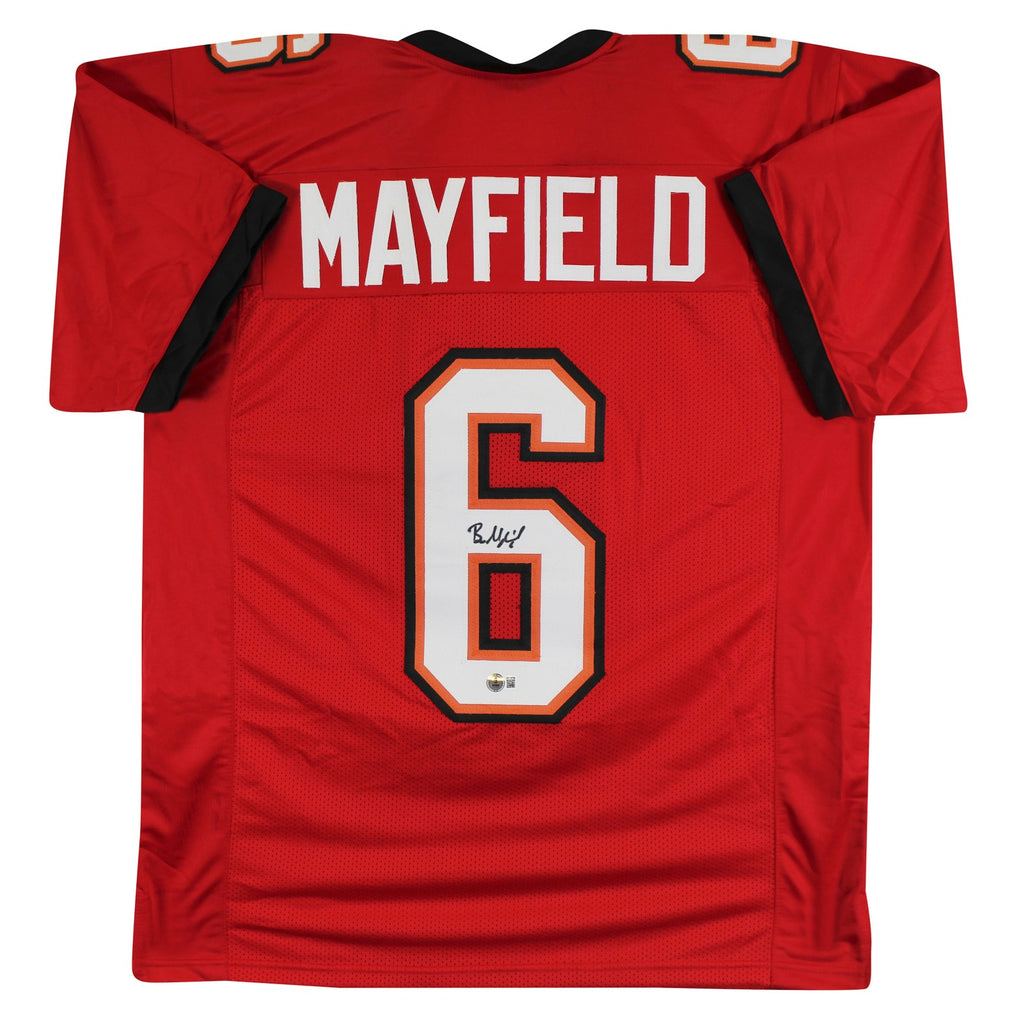 This Autographed Red Pro Style Jersey has been Personally Signed by Baker Mayfield of the Tampa Bay Buccaneers. This item is 100% Authentic to include a hologram by Beckett Authentication Services. This item will come with an affixed Beckett Authentication Services (BAS) authentication sticker, which includes a scannable QR code to verify authenticity. Please note that Beckett no longer provides serial-numbered COA cards, and the attached BAS sticker will serve as the complete authentication for this item. This is a BAS Witnessed Protection Program item which means a Beckett Authentication Service representative was present when this item was being signed. We conducted an autograph signing with Baker Mayfield where multiples of the same item were signed. While the photographs are representative of this item, the size, placement and strength of the signature may vary. Each item is hand signed, therefore, each autograph is unique. This item can be verified through BAS Witnessed. This is a X-Large sized, non-branded, custom-stitched Jersey.
