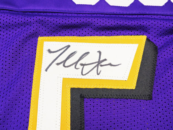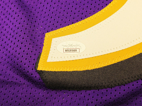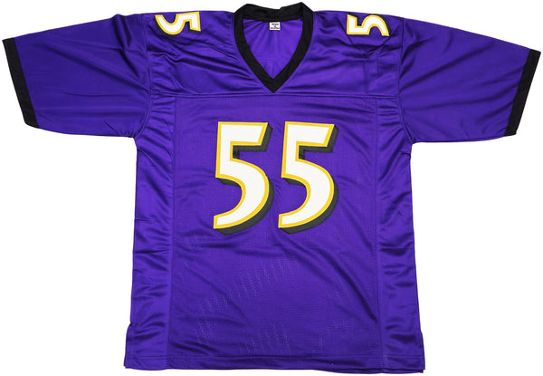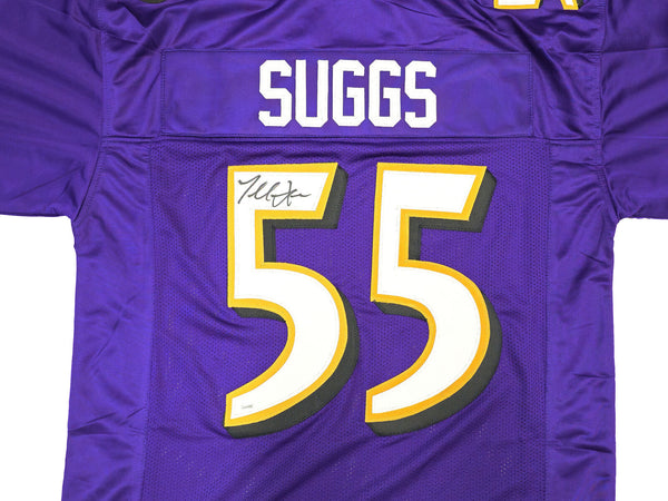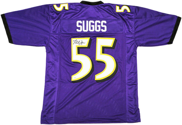This is a Purple Jersey that has been hand signed by Terrell Suggs. This is a custom jersey with no name brand. The approximate size is XL. It has nice sewn in name and numbers. This item has been certified authentic by JSA and comes with their tamper-proof sticker BUT IS MISSING the matching certificate of authenticity.