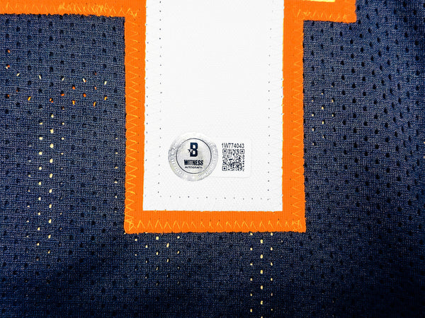 This is a Blue Jersey that has been hand signed by Brian Urlacher. This is a custom jersey with no name brand. The approximate size is XL. It has nice sewn in name and numbers. This item was inscribed "HOF 18." This item has been witnessed and certified authentic by Beckett Authentication (BAS) and comes with their tamper-proof witness sticker.