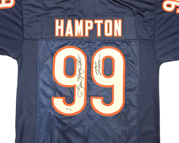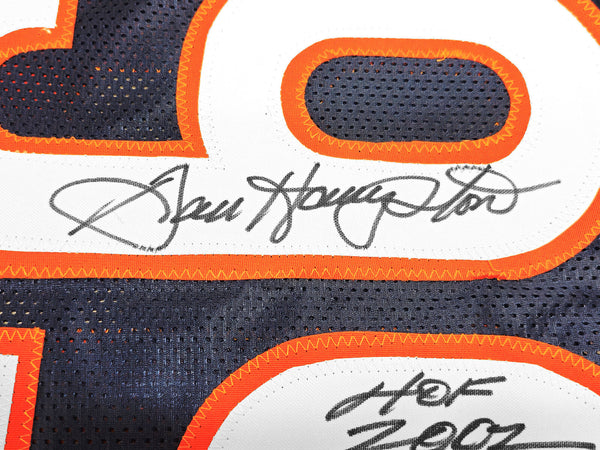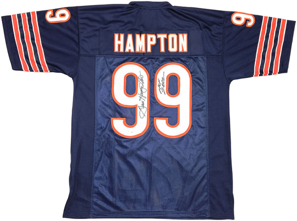 This is a Blue Jersey that has been hand signed by Dan Hampton. This is a custom jersey with no name brand. The approximate size is XL. It has nice sewn in name and numbers. This item was inscribed "HOF 2002." This item has been witnessed and certified authentic by Beckett Authentication (BAS) and comes with their tamper-proof witness sticker.