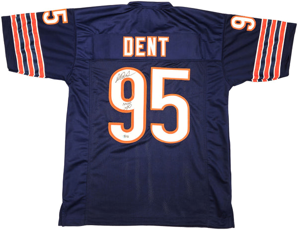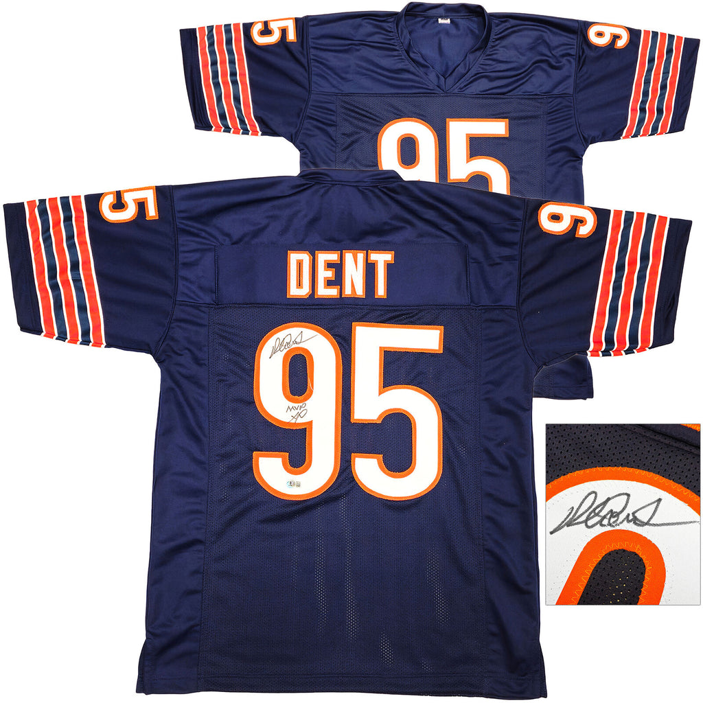 This is a Blue Jersey that has been hand signed by Richard Dent. This is a custom jersey with no name brand. The approximate size is XL. It has nice sewn in name and numbers. This item was inscribed "MVP XX." This item has been witnessed and certified authentic by Beckett Authentication (BAS) and comes with their tamper-proof witness sticker.