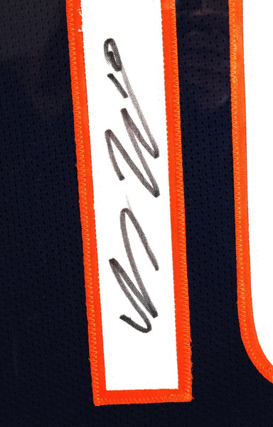 The item is a Bo Nix autographed custom navy Denver Broncos jersey framed in a deluxe frame measuring 33.5 inches in width and 39.5 inches in height. The autograph has been authenticated by Beckett Authentication Services (BAS).The framing ensemble also includes two 8x10 color photos of Bo Nix in action with the Broncos, which are matted and framed within the piece. Finally, there is a die cut Bo Nix Denver Broncos name plate featured at the bottom of the jersey.