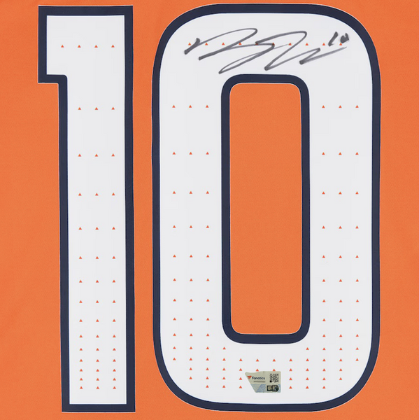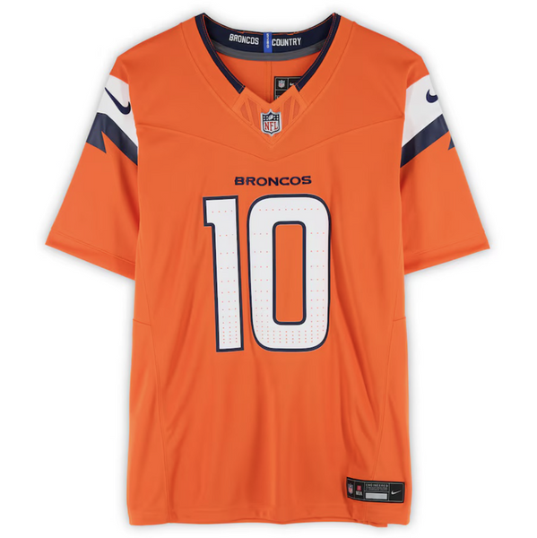 Bo Nix Autographed Denver Broncos Orange Nike Limited Jersey FanaticsThis Nike Limited jersey has been personally hand-signed by Bo Nix. It is officially licensed by the National Football League and comes with an individually numbered, tamper-evident hologram from Fanatics Authentic. To ensure authenticity, the hologram can be reviewed online. This process helps to ensure that the product purchased is authentic and eliminates any possibility of duplication or fraud.The autograph includes an official Fanatics hologram and matching COA for authenticity purposes.Comes with a tamper-evident hologram from Fanatics AuthenticatedOfficially licensed by the NFL MONEY BACK GUARANTEE! If for any reason you are not completely satisfied with the quality or authenticity of your purchase, we will gladly give you a full refund or exchange, whichever you prefer up to 30 days after purchase. Please feel free to e-mail us with any questions. Thank you. Authenticator Pre-Certified Authenticator: Fanatics Authenticated History of item: Bo Nix has signed this item in the presence of a representative from Fanatics. Describe how you came to possess this item: Super Sports Center is a fully authorized dealer for Upper Deck Authenticated as well as Mounted Memories and Steiner Sports. Other information about you and / or the item: Super Sports Center strives to deliver the most authentic in sports memorabilia from trusted companies like Mounted Memories, Steiner Sports and Upper Deck Authenticated. If it exists, we can find it for you!