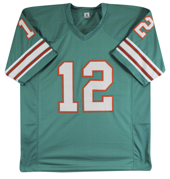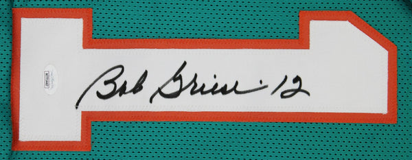 This Autographed Teal Pro Style Jersey has been Personally Signed by Bob Griese of the Miami Dolphins. This item is 100% Authentic to include a Certificate of Authenticity (COA) / hologram by JSA. We conducted an autograph signing with Bob Griese where multiples of the same item were signed. While the photographs are representative of this item, the size, placement and strength of the signature may vary. Each item is hand signed, therefore, each autograph is unique. This item can be verified through JSA. This is a X-Large sized, non-branded, custom-stitched Jersey.