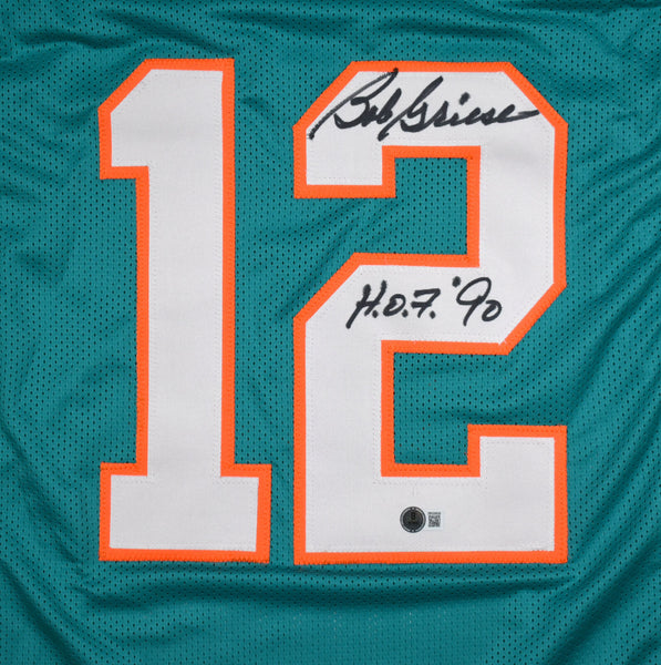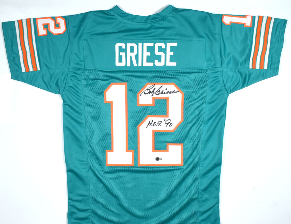 THIS IS NOT AN NFL JERSEY. THIS HAS NO TAGS, NO LOGOS, NO EMBLEMS. This is a hand autograph of Bob Griese of the Miami Dolphins on a Custom Made (non name brand) Authentic Style Jersey with stitched letters and numbers. Inscribed HOF. This item has a Beckett Witnessed Authentication, which comes with a Beckett numbered sticker hologram and a QR Code for verification. You can view this item on the Beckett Authentication website. It was signed either at a public autograph appearance or a private signing. This is a stock photo of the item. Although you may not receive this exact item, the item you receive is virtually identical and brand new in great shape. Jersey size is XL. THIS IS NOT AN NFL JERSEY. THIS HAS NO TAGS, NO LOGOS, NO EMBLEMS. This is a hand autograph of Bob Griese of the Miami Dolphins on a Custom Made (non name brand) Authentic Style Jersey with stitched letters and numbers. Inscribed HOF. This item has a Beckett Witnessed Authentication, which comes with a Beckett numbered sticker hologram and a QR Code for verification. You can view this item on the Beckett Authentication website. It was signed either at a public autograph appearance or a private signing. This is a stock photo of the item. Although you may not receive this exact item, the item you receive is virtually identical and brand new in great shape. Jersey size is XL.