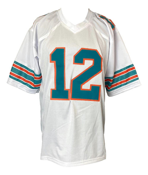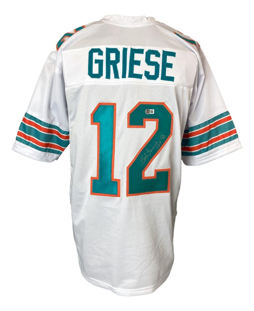 Featured is a Bob Griese signed custom football jersey, inscribed "HOF 90". This jersey has been hand signed by Griese and comes with the Beckett hologram and certificate of authenticity. This jersey features professionally sewn letters and numbers and is size XL. This jersey has no team tags or emblems and is intended as a sports collectible. SPECIFICATIONS Autographed By: Bob Griese Team: Miami Dolphins Sport: Football Authentication: Beckett Grading Services