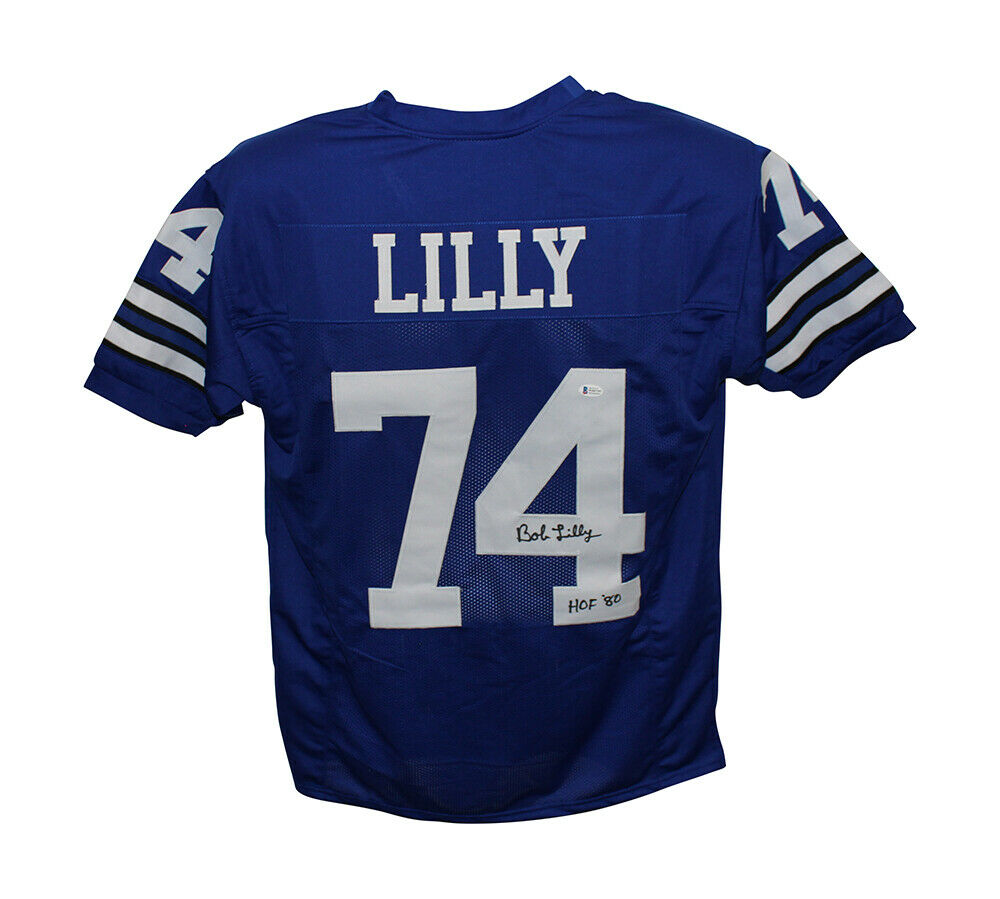 Bob Lilly Autographed/Signed Pro Style Blue XL Jersey HOF BAS 30624 The number in the listing title is just an inventory sku for our records and is not the authentication number. This is a custom pro style blue XL jersey with sewn on name and numbers that was personally autographed by Bob Lilly with HOF inscription. Includes a certificate of authenticity from Beckett Authentication Services (BAS) and Denver Autographs.