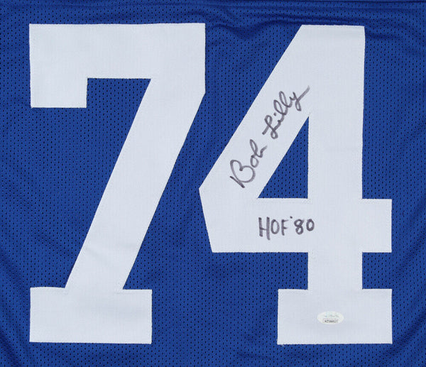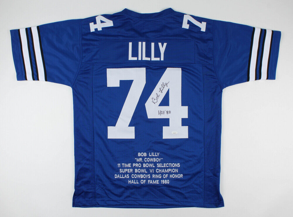 Custom on-field style jersey. Everything sewn on, size XL. Hand-signed and inscribed in black felt tip pen by Bob Lilly (HOF). The autograph includes an official James Spence Authentication (JSA) hologram and matching COA for authenticity purposes. The signing of this item was witnessed by JSA.Authentication: JSA COA