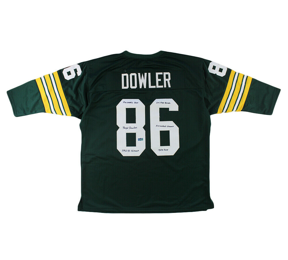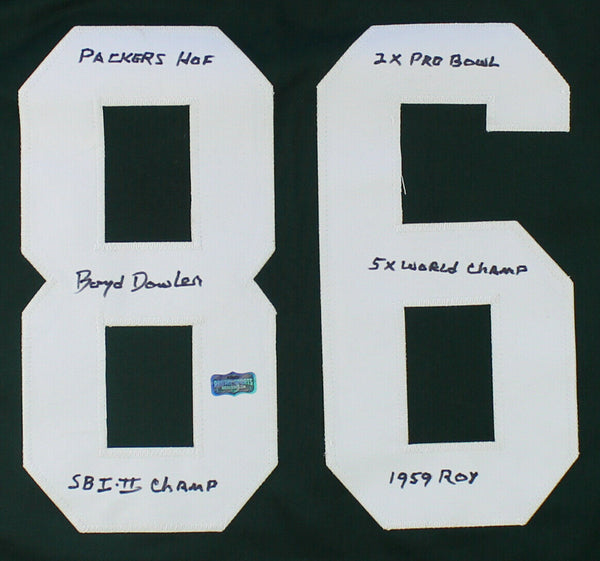 A Green Bay Custom Green Jersey hand signed by Boyd Dowler. The item and signature are in excellent condition. In addition to signing his name, Boyd also inscribed "Packers HOF, SB I & II Champ, 1959 ROY, 5x World Champ & 2x Pro Bowl" on the item. Boyd is a Former Football wide receiver. He played 11 seasons with the Green Bay Packers. He is a 2x Pro Bowler, 5x NFL Champion, 2x Super Bowl Champion and is a Packers Hall of Famer. AUTHENTICATION: The item is accompanied by a Certificate of Authenticity - Serial Numbered & Databased Hologram - Picture of Boyd from the signing.