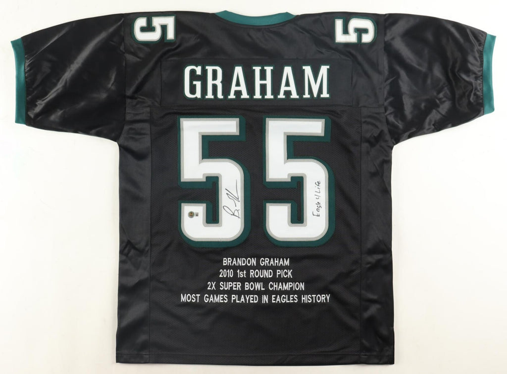 Custom on-field style jersey. Everything is sewn on, size XL. Hand-signed by Brandon Graham.The autograph includes an official Beckett Authentication Services serially numbered hologram and QR Code card for authenticity purposes. The signing of this item was witnessed by Beckett.Authentication: Beckett QR Code card