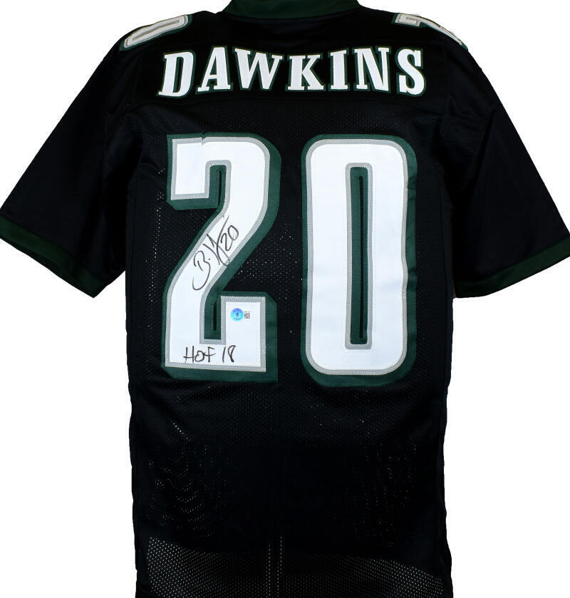 Brian Dawkins Autographed Black Pro Style Jersey w/HOF- Beckett W Hologram *Black THIS IS NOT AN NFL JERSEY. THIS HAS NO TAGS, NO LOGOS, NO EMBLEMS. This is a hand autographed Jersey of Brian Dawkins. This is Custom Made (non name brand) Authentic Style (stitched letters and numbers). Inscribed HOF. This item has a Beckett Witnessed Protection Authentication, which comes with a numbered sticker hologram and a QR code for verification. You can view this item on the Beckett website. It was signed either at a public autograph appearance or a private signing. This is a stock photo of the item. Although you may not receive this exact item, the item you receive is virtually identical and brand new in great shape. Jersey size is XL.