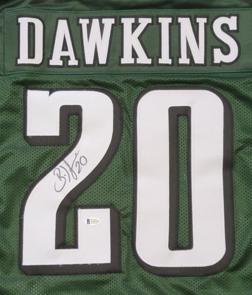 Custom on-field style jersey. Everything is sewn on, size XL. Hand-signed by Brian Dawkins (HOF).The lot / autograph(s) includes an official Beckett Authentication Services serially numbered hologram and QR Code card for authenticity purposes. The signing of this item was witnessed by Beckett.Authentication: Beckett Hologram with QR Code card