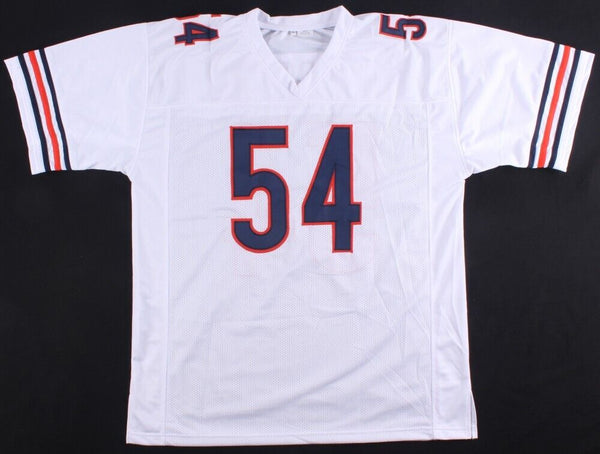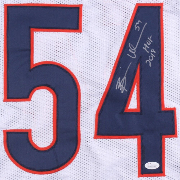 Custom on-field style jersey. Everything sewn on, size XL. Hand-signed in silver paint pen by Brian Urlacher. The autograph includes an official James Spence Hologram and matching COA for authenticity purposes. The signing was witnessed by JSA.Authentication: JSA COA