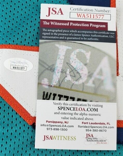 This autographed jersey has been personally hand-signed by Brock Marion of the Miami Dolphins.This autograph is certified by James Spence Authentication's (JSA) Witnessed Protection Program. That means that a JSA representative was present when this item was signed. It comes with the numbered hologram and matching Certificate of Authenticity.Custom on-field style jerseys are a more affordable option for autograph seekers. These jerseys do not have any brand name or tags and are made in the Philippines. They feature stitched on names and numbers and are made to look very similar to the on-field jerseys that the players wear. These custom jerseys are very commonly used in the memorabilia industry.