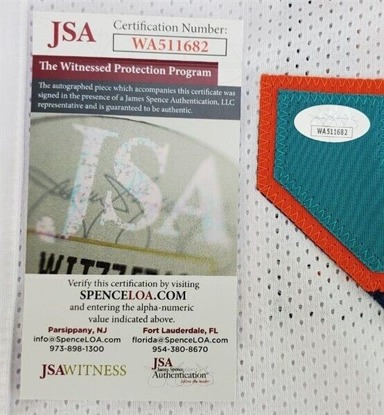 This autographed jersey has been personally hand-signed by Brock Marion of the Miami Dolphins. This autograph is certified by James Spence Authentication's (JSA) Witnessed Protection Program. That means that a JSA representative was present when this item was signed. It comes with the numbered hologram and matching Certificate of Authenticity.Custom on-field style jerseys are a more affordable option for autograph seekers. These jerseys do not have any brand name or tags and are made in the Philippines. They feature stitched on names and numbers and are made to look very similar to the on-field jerseys that the players wear. These custom jerseys are very commonly used in the memorabilia industry.