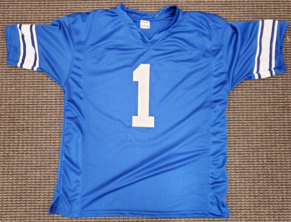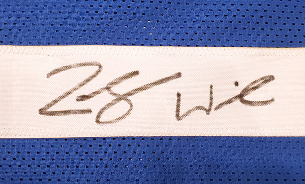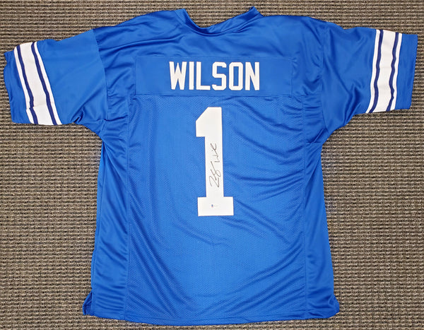 This is a Royal Blue Jersey that has been hand signed by Zach Wilson. This is a custom jersey with no name brand. The approximate size is XL. It has nice sewn in name and numbers. This item has been certified authentic by Beckett Authentication (BAS) and comes with their tamper-proof sticker and matching certificate of authenticity.