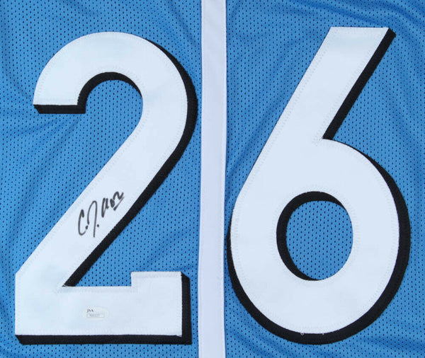 Custom on-field style jersey. Everything is sewn on, size XL. Hand-signed in black felt-tip pen by C. J. Anderson. The lot / autograph(s) includes an official James Spence Authentication (JSA) hologram and matching COA for authenticity purposes.Authentication: JSA COA