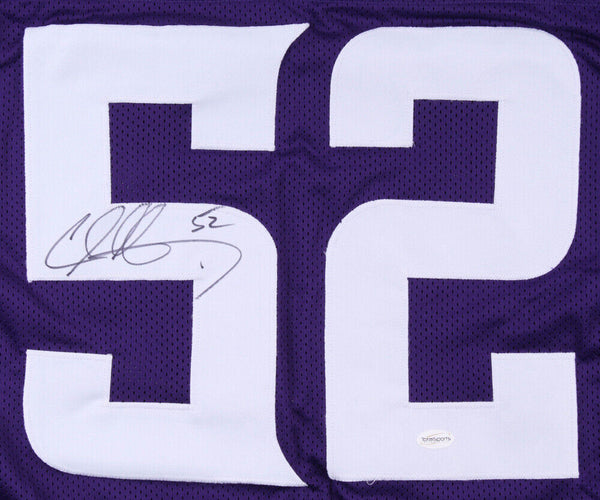 Custom on-field style jersey. Everything is sewn on, size XL. Hand-signed in black felt-tip pen by Chad Greenway. Greenway's career highlights have been custom stitched on the back of the jersey under the reverse numbers. The lot / autograph(s) includes an official Total Sports Enterprises (TSE) hologram for authenticity purposes.Authentication: Total Sports Enterprises Hologram