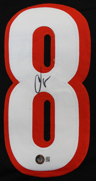 This Autographed Black Pro Style Jersey has been Personally Signed by Chad Johnson of the Cincinnati Bengals. This item is 100% Authentic to include a hologram by Beckett Authentication Services. This item will come with an affixed Beckett Authentication Services (BAS) authentication sticker, which includes a scannable QR code to verify authenticity. Please note that Beckett no longer provides serial-numbered COA cards, and the attached BAS sticker will serve as the complete authentication for this item. This is a BAS Witnessed Protection Program item which means a Beckett Authentication Service representative was present when this item was being signed. We conducted an autograph signing with Chad Johnson where multiples of the same item were signed. While the photographs are representative of this item, the size, placement and strength of the signature may vary. Each item is hand signed, therefore, each autograph is unique. This item can be verified through BAS Witnessed. This is a X-Large sized, non-branded, custom-stitched Jersey.