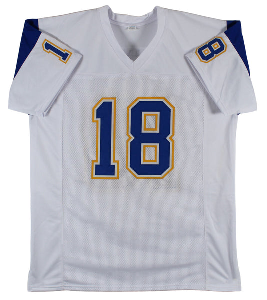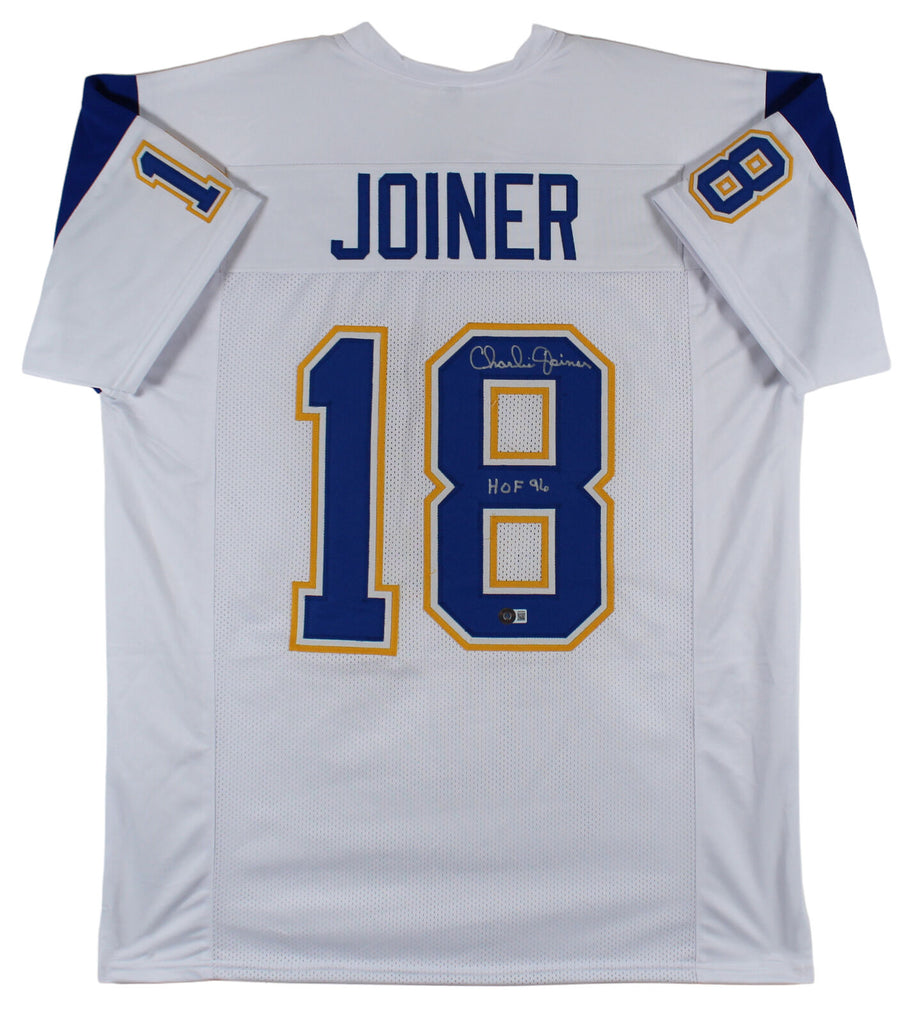 This Autographed White Throwback Pro Style Jersey with the inscription of "HOF 96" has been Personally Signed by Charlie Joiner of the San Diego Chargers. This item is 100% Authentic to include a hologram by Beckett Authentication Services. This item will come with an affixed Beckett Authentication Services (BAS) authentication sticker, which includes a scannable QR code to verify authenticity. Please note that Beckett no longer provides serial-numbered COA cards, and the attached BAS sticker will serve as the complete authentication for this item. This is a BAS Witnessed Protection Program item which means a Beckett Authentication Service representative was present when this item was being signed. We conducted an autograph signing with Charlie Joiner where multiples of the same item were signed. While the photographs are representative of this item, the size, placement and strength of the signature may vary. Each item is hand signed, therefore, each autograph is unique. This item can be verified through BAS Witnessed. This is a X-Large sized, non-branded, custom-stitched Jersey.